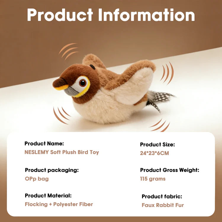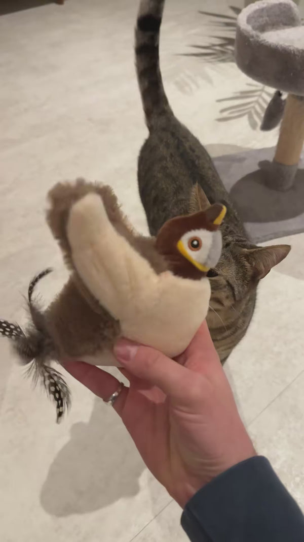 Upgrade to the PawUnder Interactive Plush Bird. It features realistic wing flapping and vivid chirps—not weak movements or loud screeches that hurt your cat's ears. Plus, it’s USB Rechargeable and Activated by Touch, giving your cat endless, hassle-free fun.