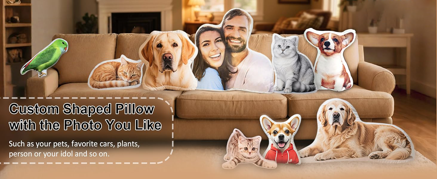 It’s a one-of-a-kind pillow made from your pet’s photo — printed in high resolution, cut to the exact shape of your furry friend, and filled with soft, fluffy cotton.
